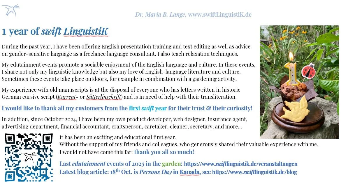 Über die oberhalb der Bilder stehenden Links geht es zu meinen weiteren Angeboten, wie kulturellen Events (Afternoon Teas, Wanderungen, Gartenveranstaltungen: Veranstaltungen) und meinem Transliterationsdienst für alte deutsche Laufschriften (also Sütterlin, Kurrent). Auf meinem Blog gibt es Beiträge zu Sprache (Swift Stories).